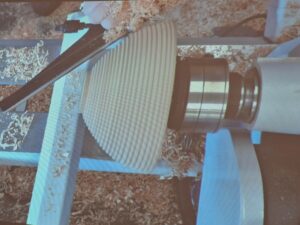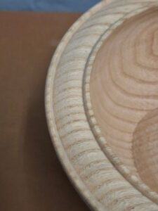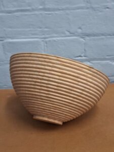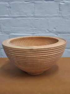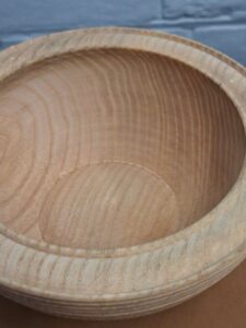 The next item was a bowl where he once again concentrated on technique with the various toots and deliberately caused catches to emphasise what causes them. Les also showed how he creates a ripple effect of continuous beads with a gouge in one rhythmic motion right up side of the bowl using alternate bevel rub cut and then scraping cut. He also spoke about design and shaping and showed an alternative rim to the bowl with beads to emphasise it. An undercut rim and a domed bottom allowed him to show further techniques and cuts.