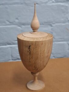 What a great day with Les. We had a very good turnout including several new members so 31 altogether. Les started with a goblet shaped lidded urn on a small stem with a reversible finial on the lid. It was made in three parts with an interference fit on the foot and a looser fit on the lid so it could be easily reversed. This demo piece was all about the correct way to use the tools and planning the work in advance so that the holding of the pieces did not become a problem. He showed how to make great use of a jam chuck for smaller pieces for finishing. Les places a great deal of emphasis on the right tool for the job. Having turned a long pointed finial, he reversed it through the chuck jaws and created a teardrop finial on the other side of the lid. He commented that it wasn’t much use for storage but nice to change the appearance easily. Sorry I didn’t get a picture of the alternative finial.