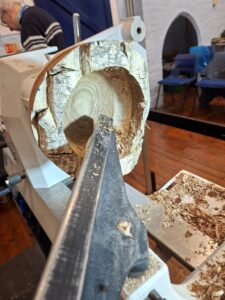 Nicholas talked us through his process to ensure the bark stays intact using a stabilising CA glue and also the direction of cut to place the least amount of stress on the bark. He also described how the tools cut differently through the bark to the soft outer layer and then into the solid wood. The following pics shown some of his gallery pieces and also the shaping on the lathe. Nicholas showed us how he uses a  one inch pin chuck to hold the log for initial cutting and later in the demonstration how he reverses the bowl onto a set of large jaws which are set against small ridge inside the bowl and expanded. This a technique from Richard Raffan but difficult to photograph during the demo as it all happens inside the bowl but you can see how Richard does it on the YouTube video at the bottom of this page.