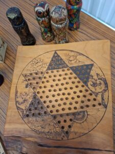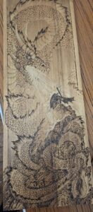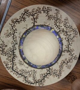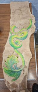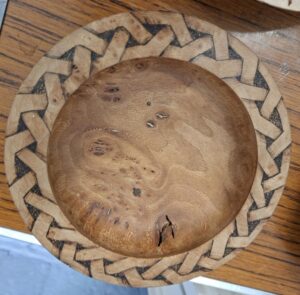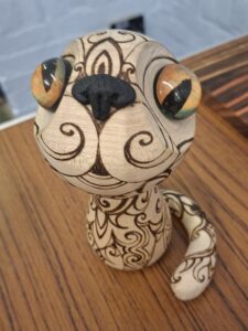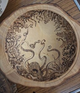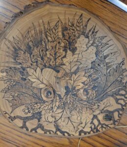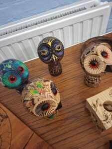 Tic showed us some advanced pyrography and colouring to give some new ideas to enhance your work and learn a new facet to woodturning. She brought along a wide variety of her work and described how she uses various heating tips to achieve the effects she desires and the importance of getting the temperature just right. In the pictures below you will see just what can be done with heat and colour.