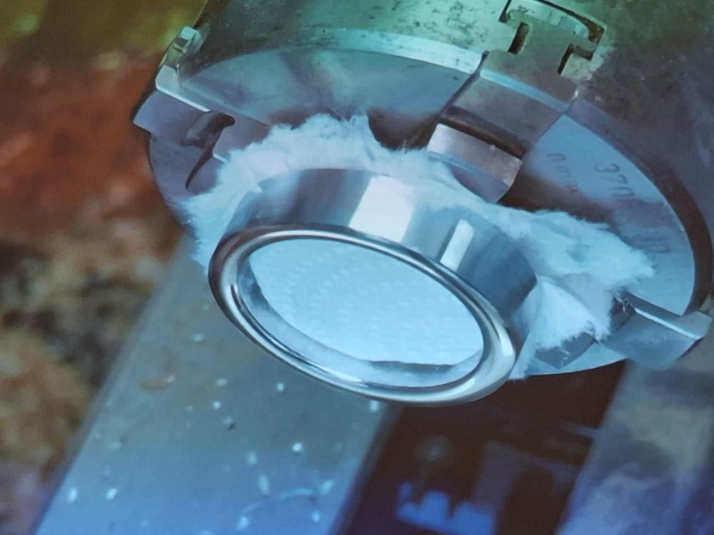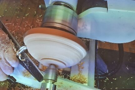 As well as texturing you can create a black rim using a chemical patina fluid and three examples are shown. Don’t use ones designed for lead, you need ones that work on tin or copper. The next task is to remount the mould in the lathe and to face it off ensuring that there are no holes or blemishes. Paul then cut a tenon in the pewter to exactly match the mortice on the bowl. Paul puts paper on the lathe bed to catch any pewter shavings and these go straight back into the pot to re-melt.