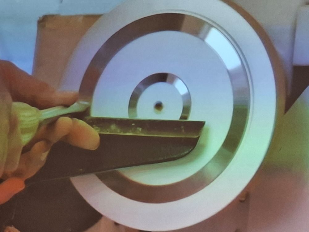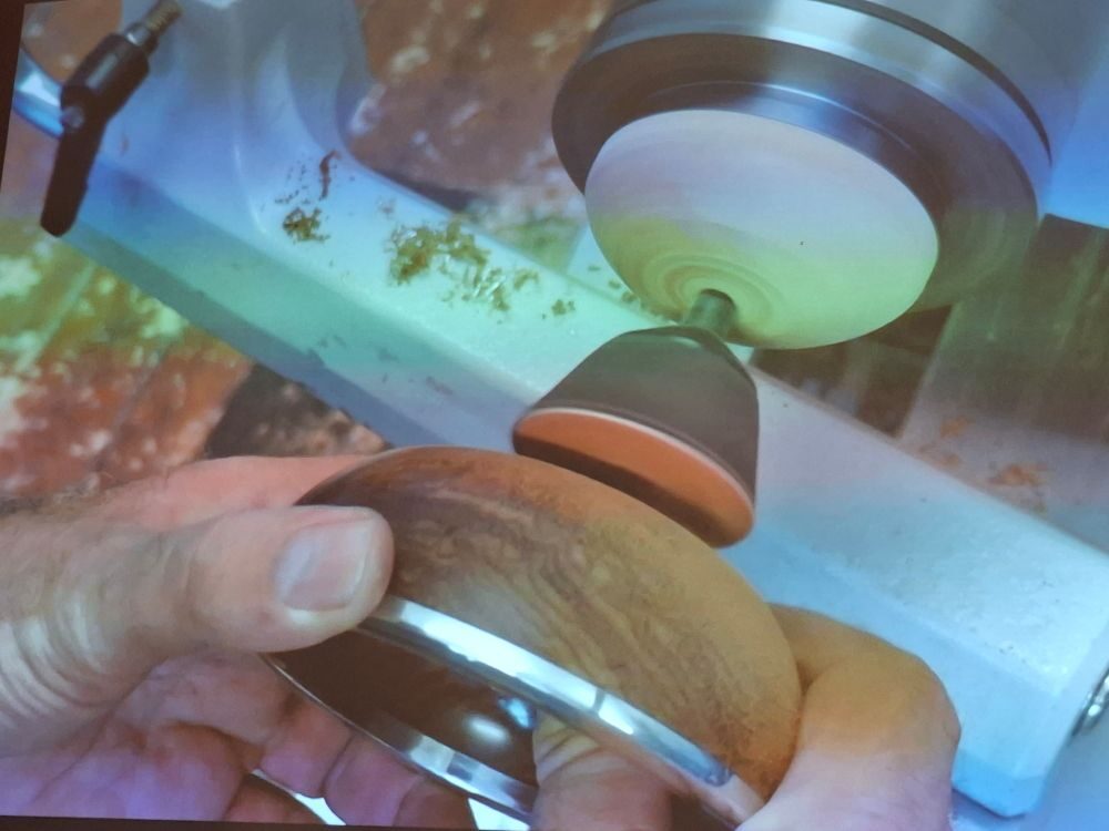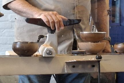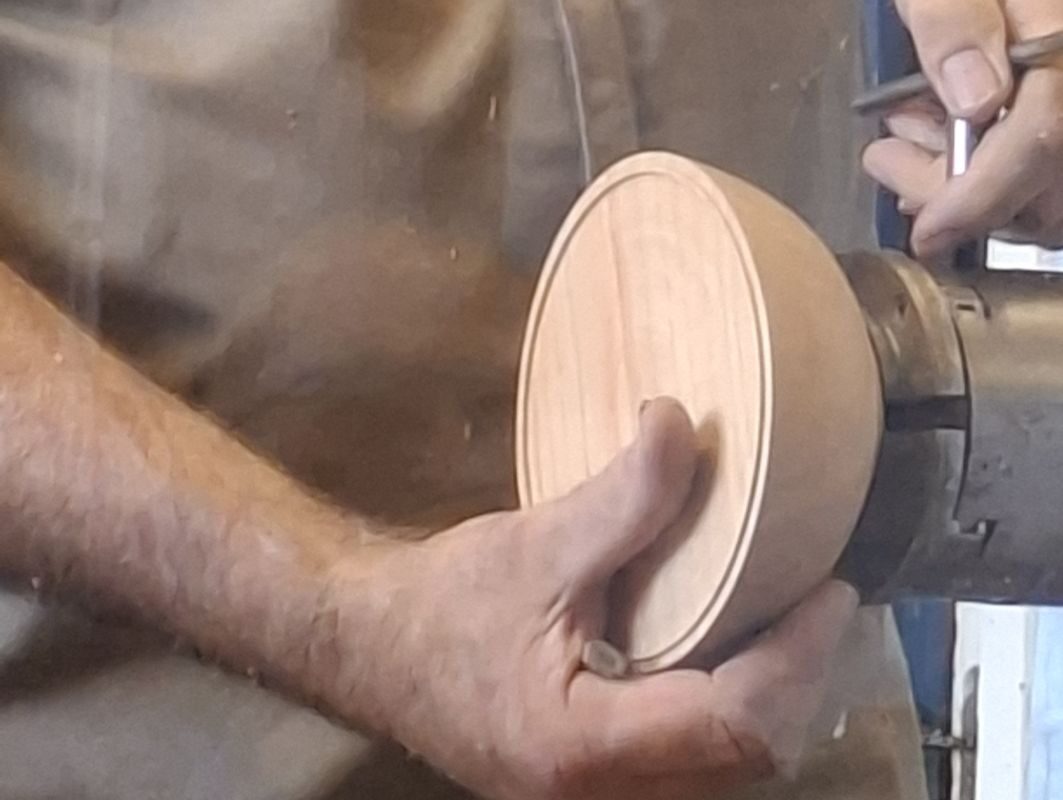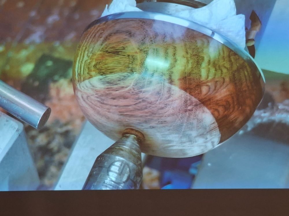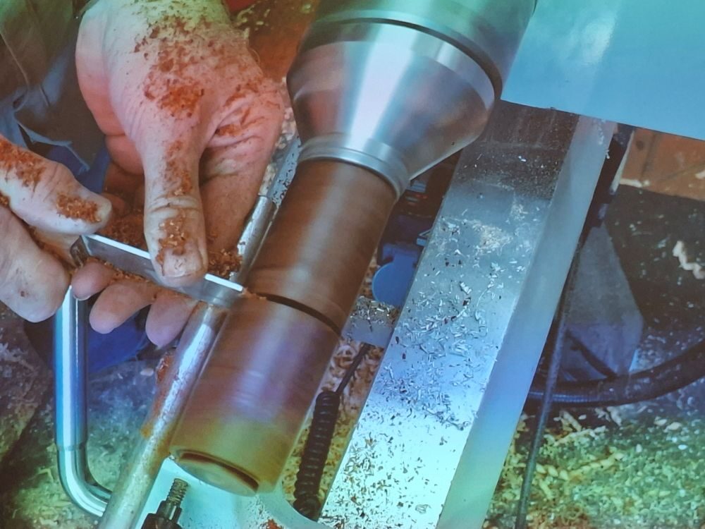 Paul showed us some sample bowls and then quickly turned the outside of his demo piece. After reversing it onto a chuck he faced off the top of the bowl and then cut a groove (mortice) for the pewter rim to be glued into.