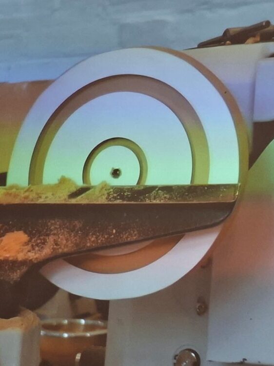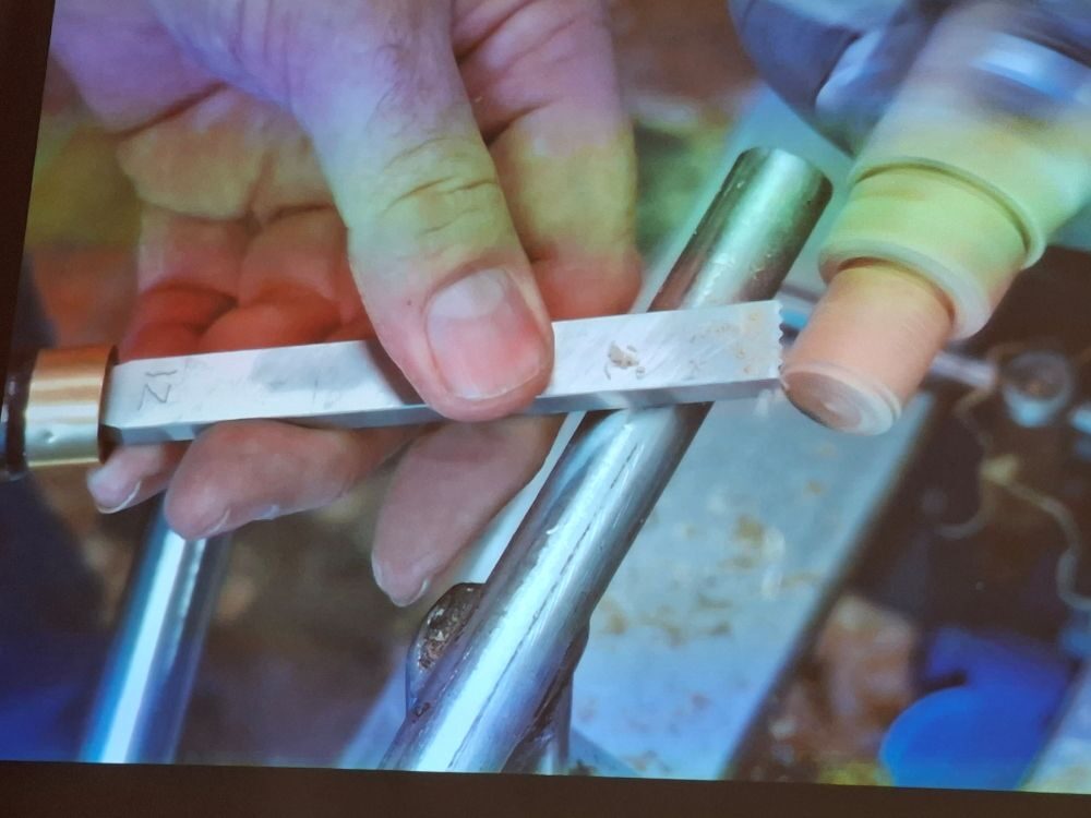Pewter melts at around 230 degrees C and so it can be done in a saucepan but a scum forms on the top that you don’t want in your mould and trying to pour from a saucepan and keep everything safe and ‘clean’ is not easy. The pot allows the molten metal to flow from the bottom where there is no scum. These pots are around £85. Paul also showed us that pewter can be textured with our normal HSS tools just like wood.