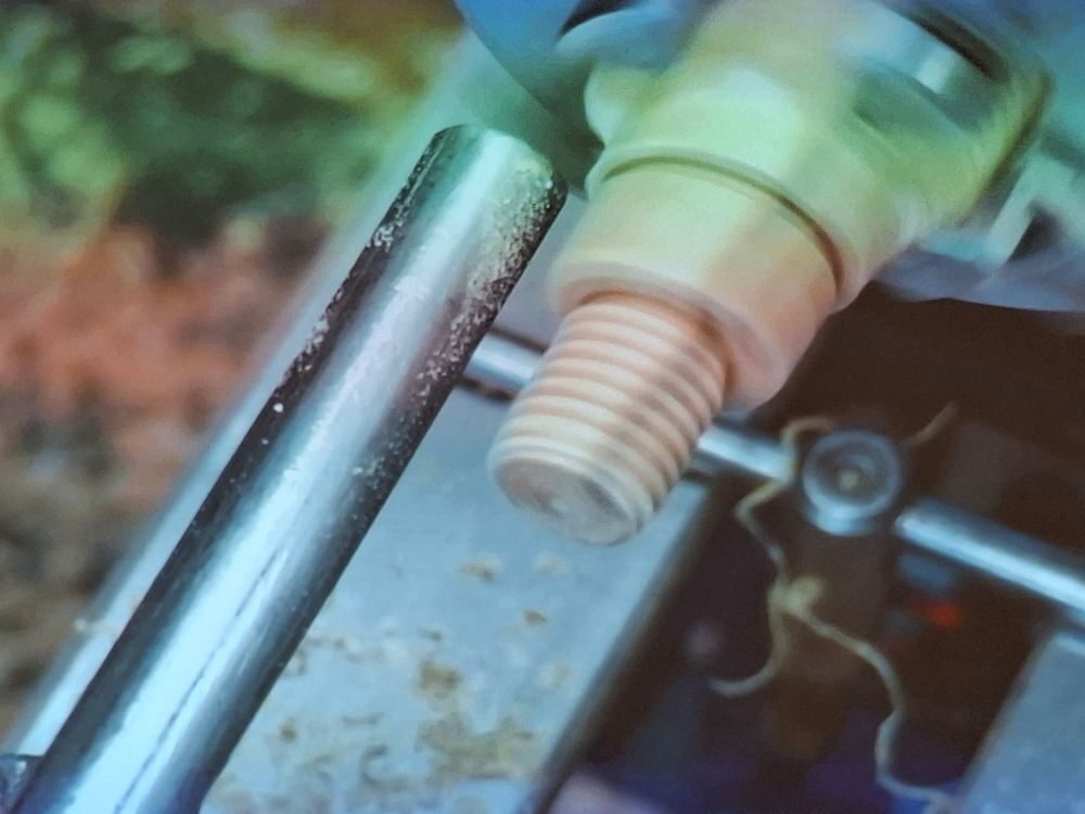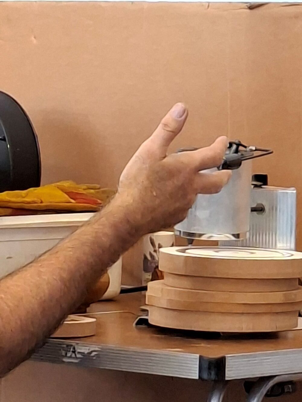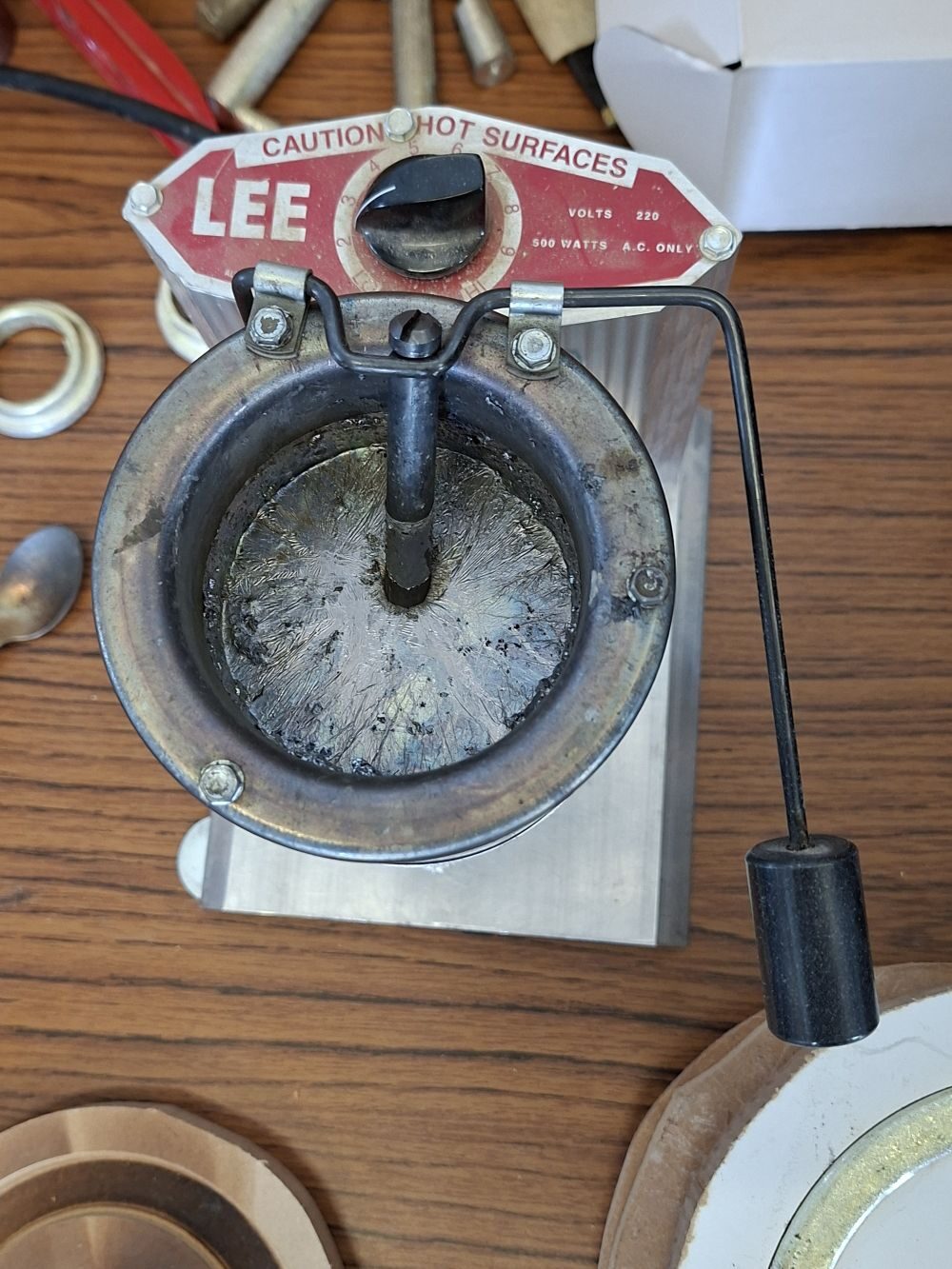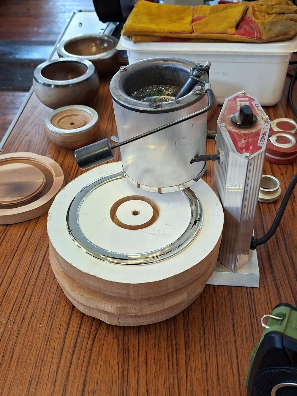 The pewter is melted in a small electric pot with simple release valve at the bottom to let the molten metal flow with great accuracy. The mould is raised up to be immediately below the nozzle to avoid splashing. The mould must be level and the metal simply flows all the way around (no rotating or shaking the mould is required). Paul gets his pewter in 1 kg ingots and it is lead free. They cost around £30 and will make about 3 rims. See at the bottom of the article for details of suppliers of things shown.