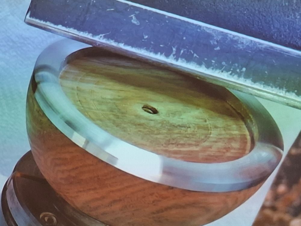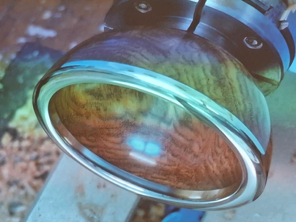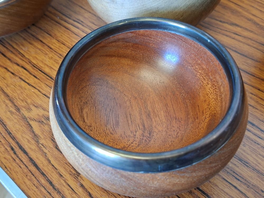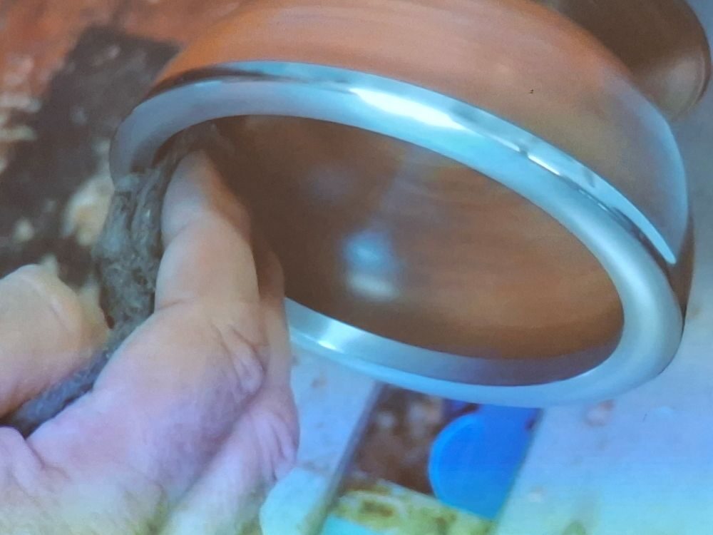 Paul releases the rim from the mould by using a parting tool either side of it and then gently levering it out. The rim is then stuck onto the bowl and then remounted onto the lathe for shaping. The rim is cast slightly oversized so that a smooth transition from pewter to wood can be obtained (cut from wood to pewter to avoid any staining). The inside of the bowl can now be cored out and again create a smooth transition to the rim. The rim is now polished with 0000 grade wire wool followed by a chrome cleaner (Paul uses Autosol Solvol) being careful to avoid staining the wood. The wood part can now be finished.