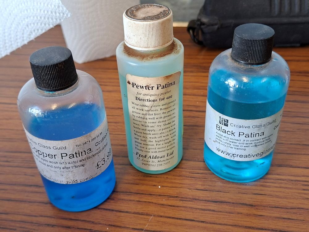 The chemicals were pewter patina (or black patina) and copper patina. Make sure you get ones intended for use on tin/pewter as some of those made for lead don’t work too well on tin.