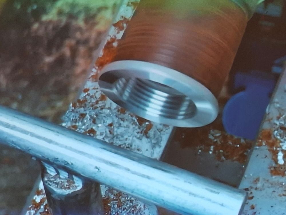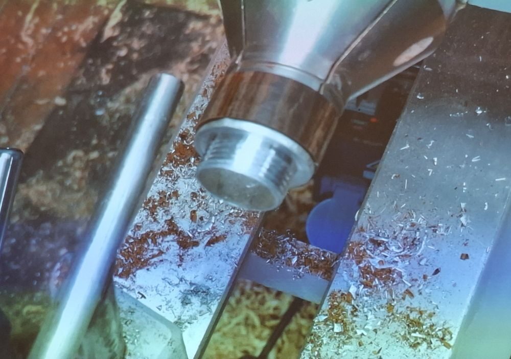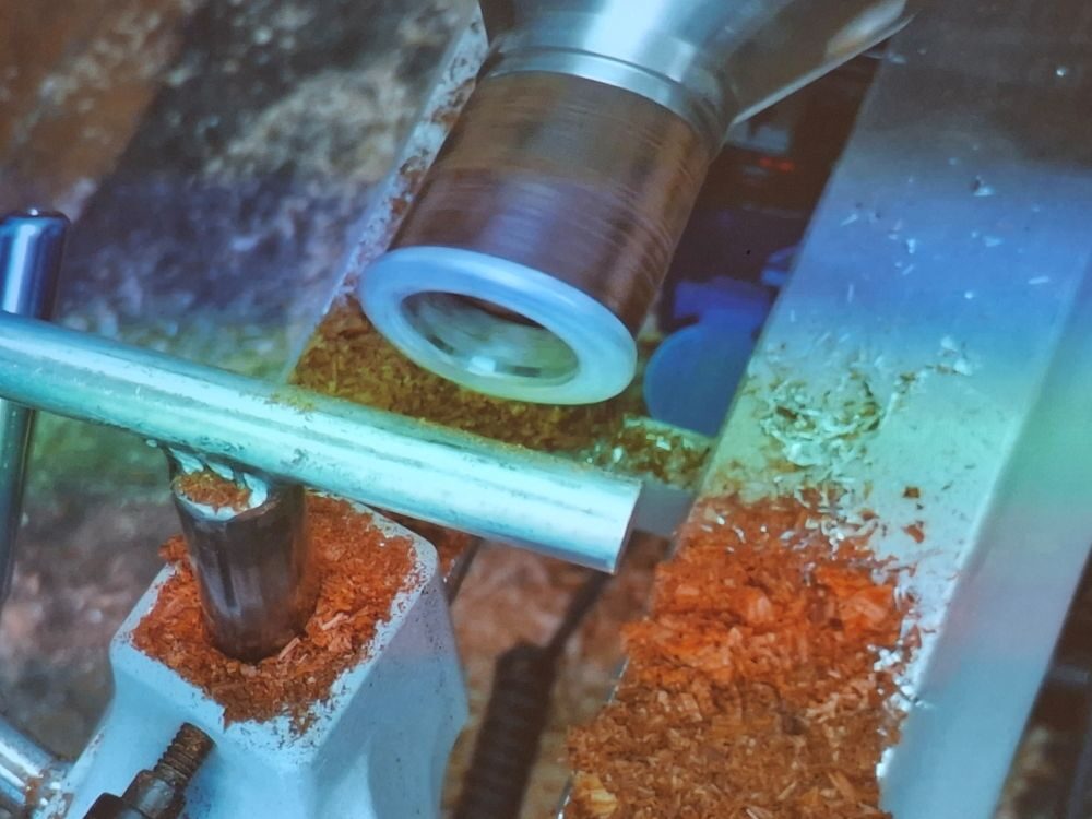 Paul then showed the technique he uses to cut threads before preparing a piece of Cocobolo to make a threaded box using pewter. He had precast the sections for the box threads and showed how the thread cutter works just as well on pewter.