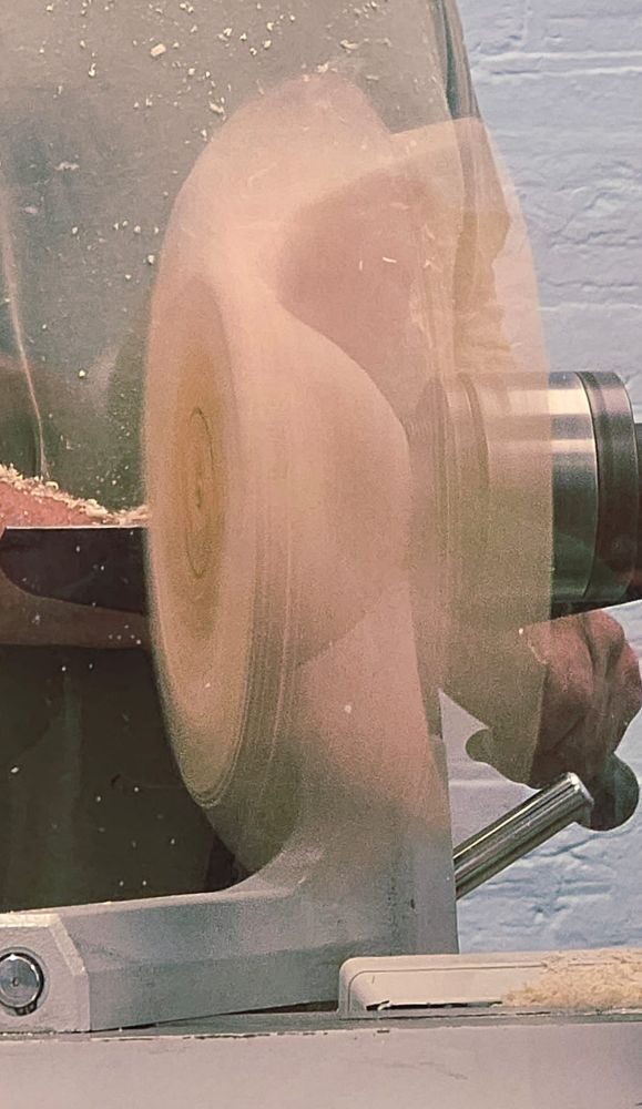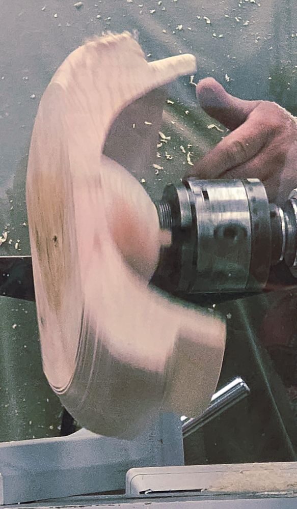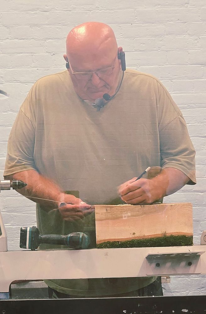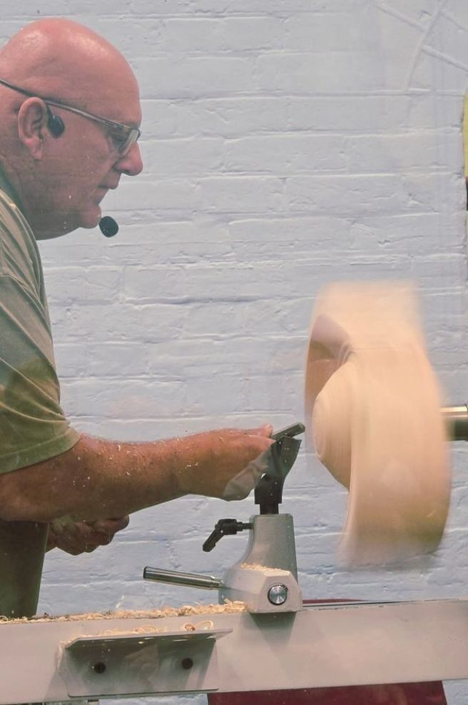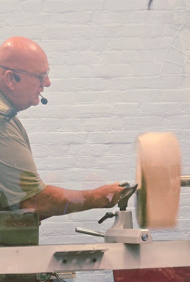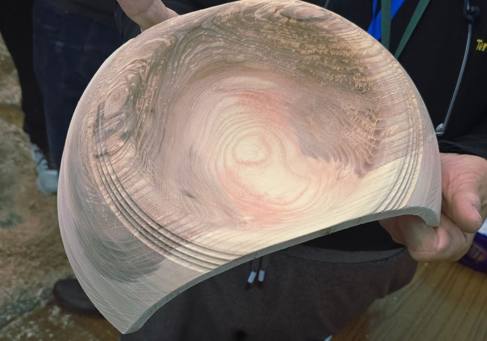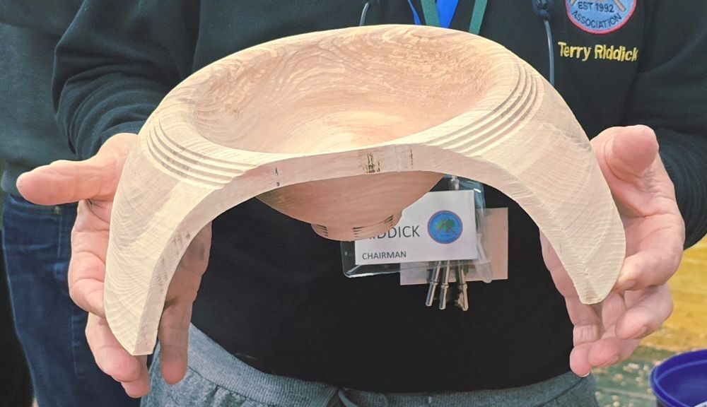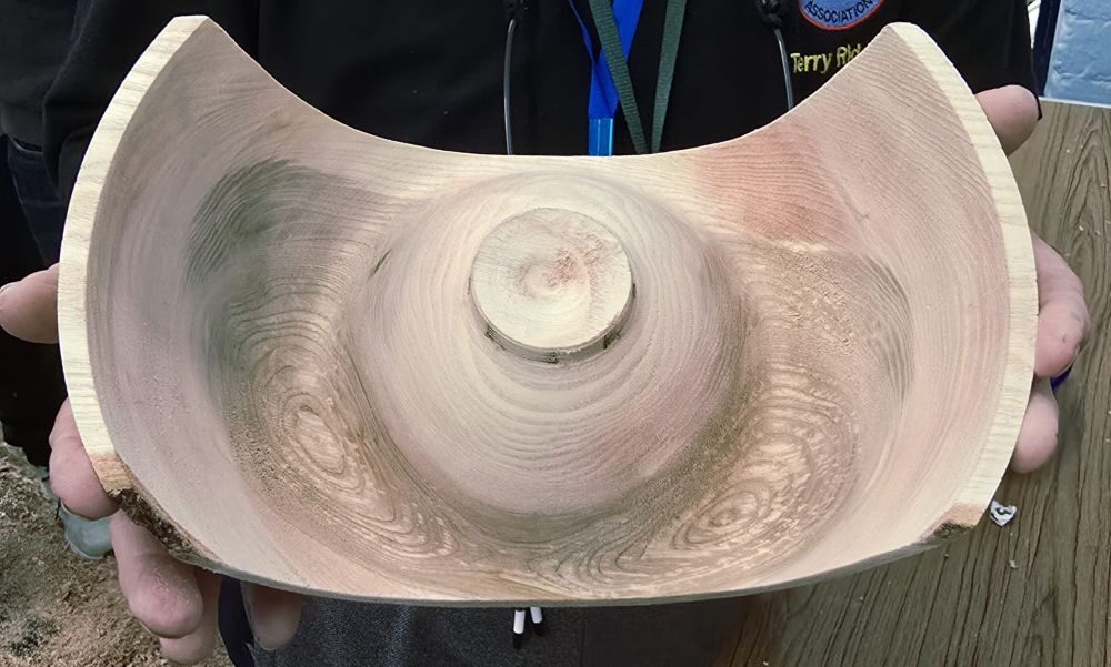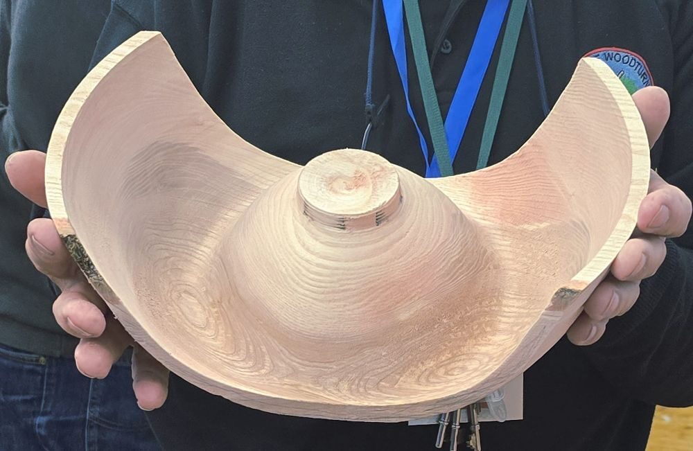 Shaun showed us how to turn a winged bowl from a oblong ‘green’ log. He set the log onto a screw chuck on the eventual topside of the bowl so he could create a tenon on the bottom of the bowl for reversing. As this was an oblong, this meant that at each end the cut was partially in air so it is important to have enough speed so that it appears to be round but ‘ghosted’. By this we mean that you can see through the piece but still see the outline to cut. All cuts must be presented to the wood carefully to avoid nasty catches. If you look at the following images you will see the ‘ghosting on the outer sections whereas the bowl in the centre is a solid view as it is the width of the wood. After reversing Shaun cut the inside of the bowl. One of the biggest challenges is how to remove the tenon as holding with a deep profile needs some thought.