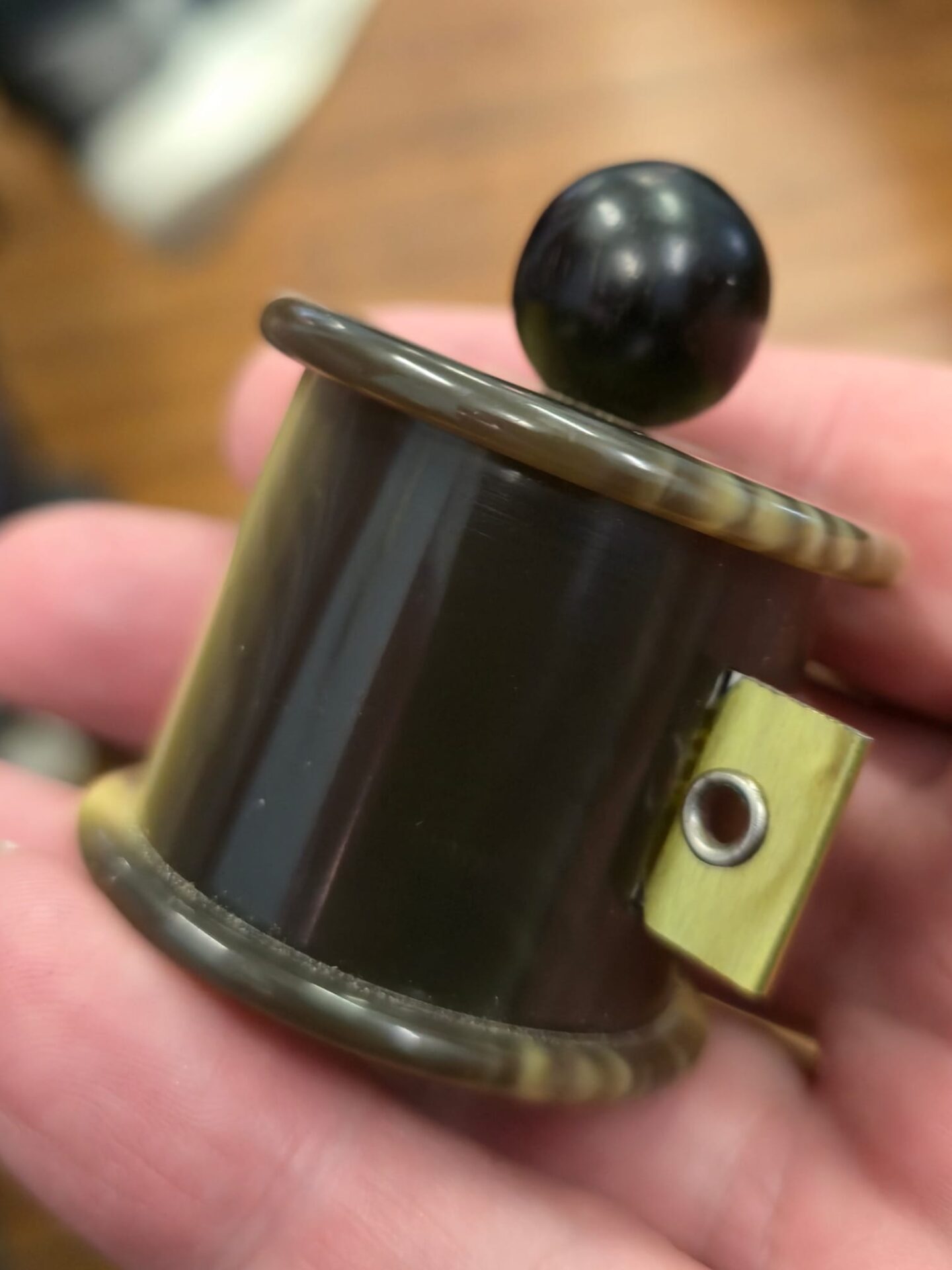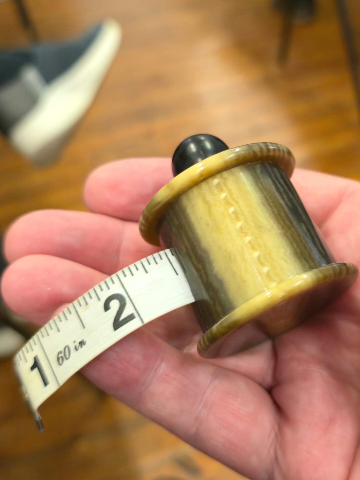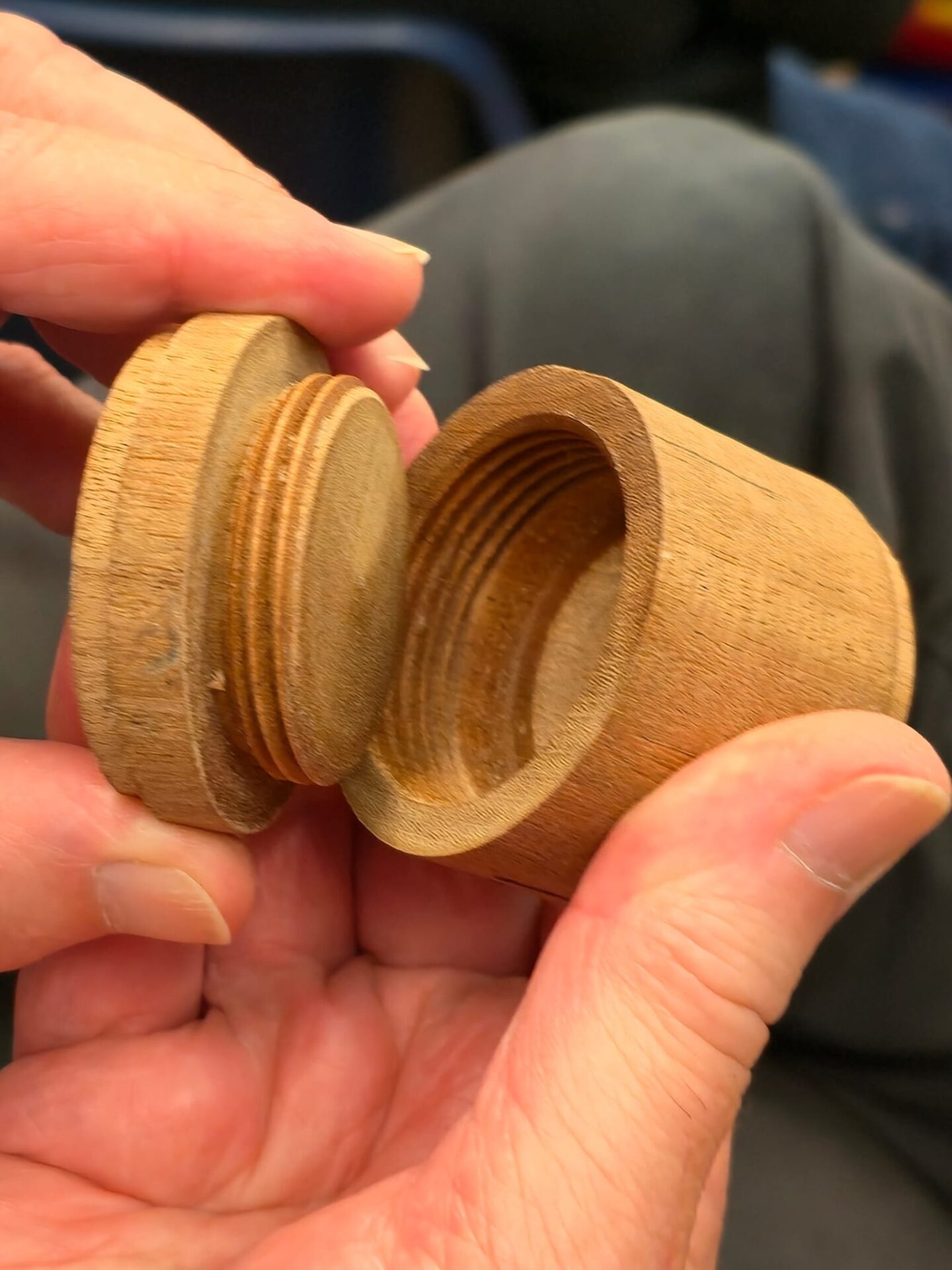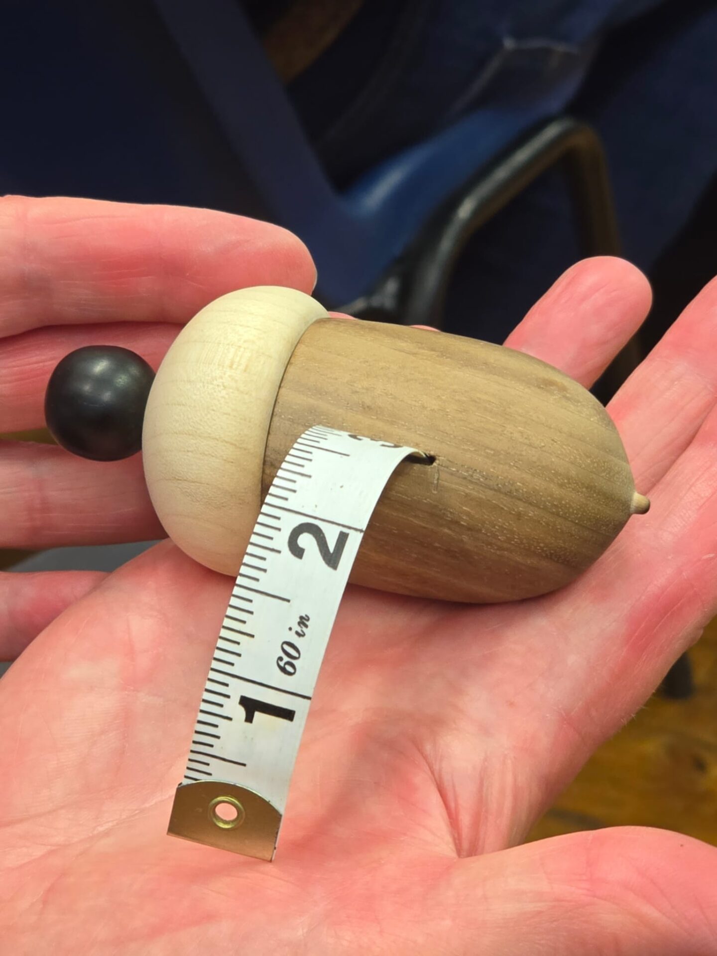 Simon started off the evening by making a small box in the shape of an acorn with a threaded lid. He demonstrated just how versatile his jig is and once familiar with setting it up, how quickly both male and female threads can be cut. For the regular threaded boxmaker this jig gives consistant results. He handed around some samples that have a tape measure inside that is wound back in using a knob at the top of the box. The pictures below tell the story.