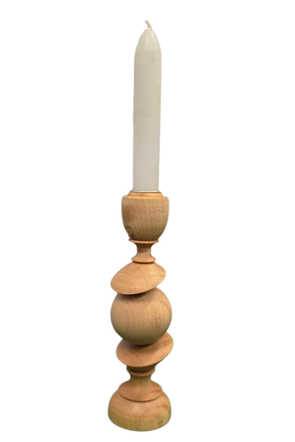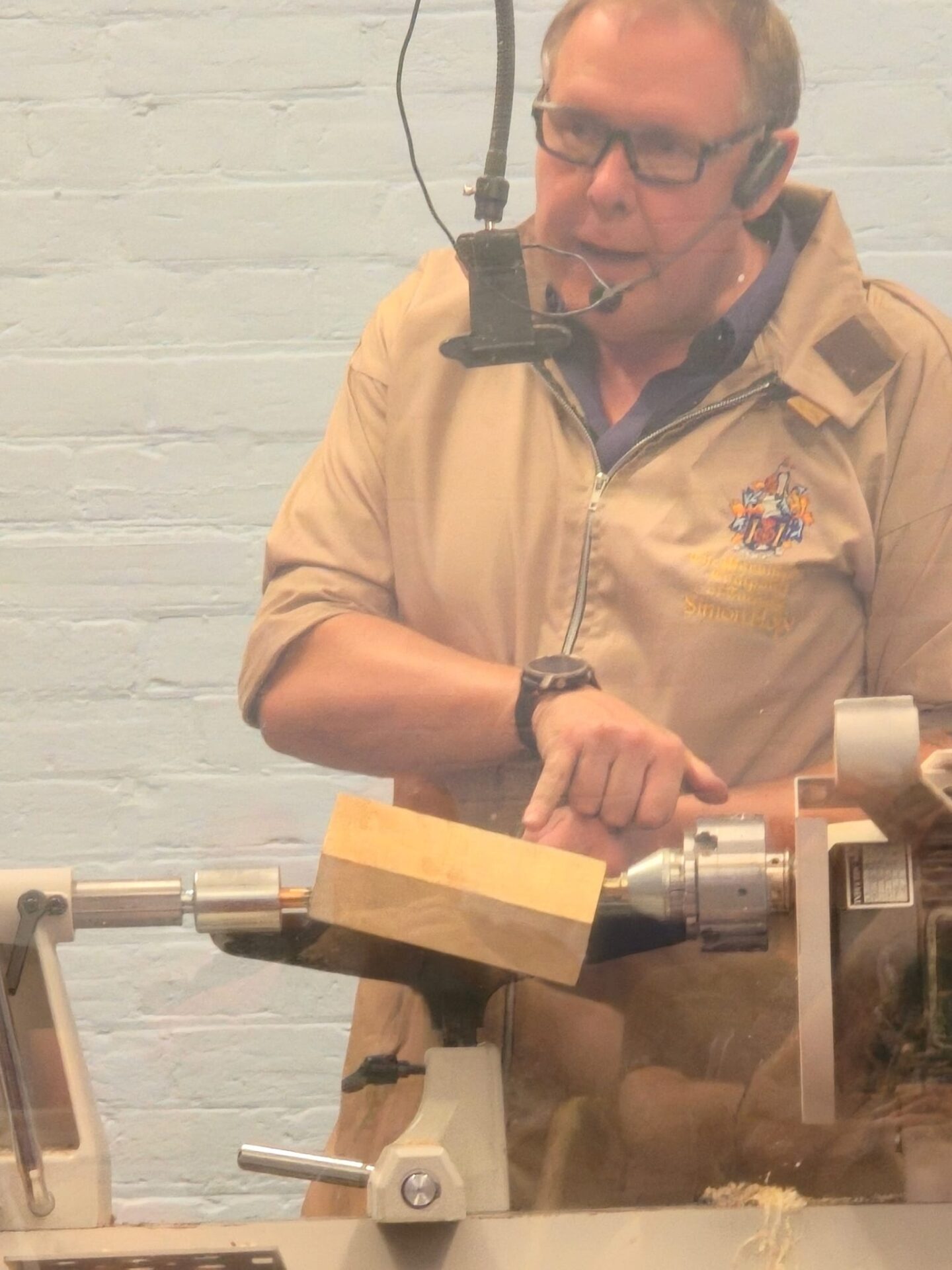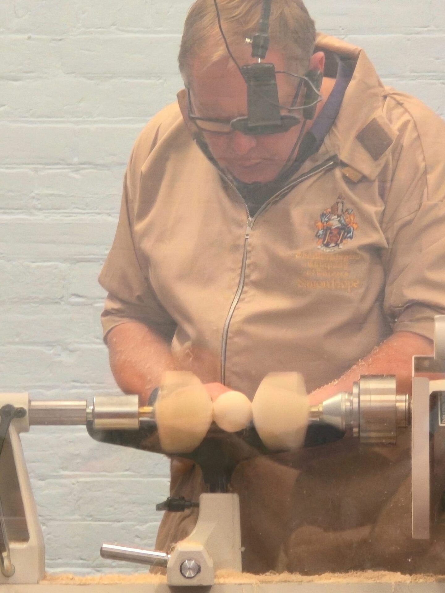 Simon then went to to describe and demonstrate offset turning. A full article about offset turning can be found on the Workshop Tips and Ideas page (click the link at the bottom of this article). As you can see in the pictures, he showed how the blank is mounted off centre to cut the skewed shapes but returned to centre to create the ball in the middle.